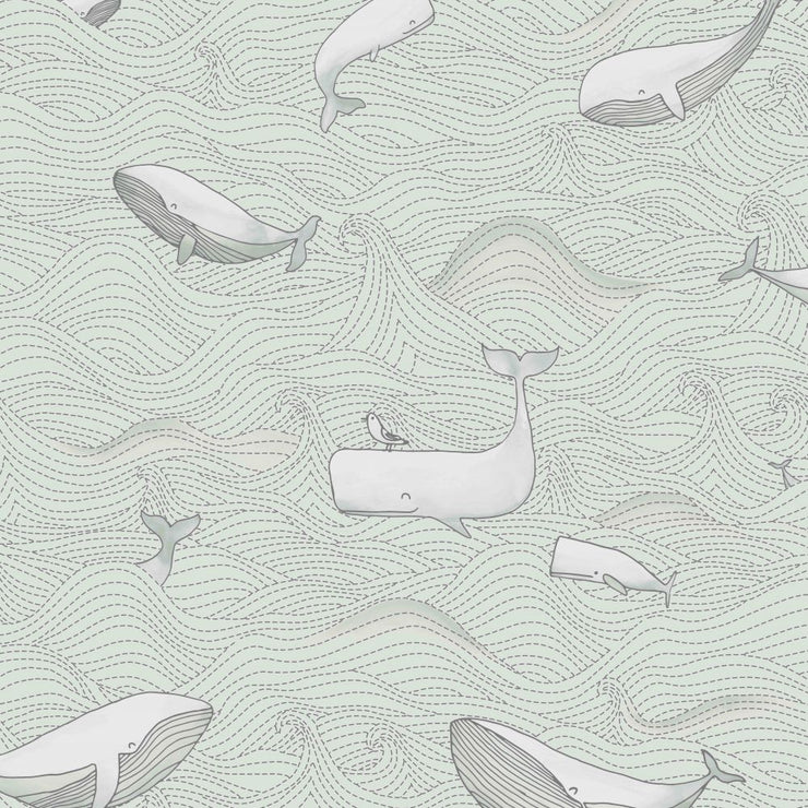 In this whimsical wallpaper design, sweetly illustrated whales happily swim through stylized ocean waves.