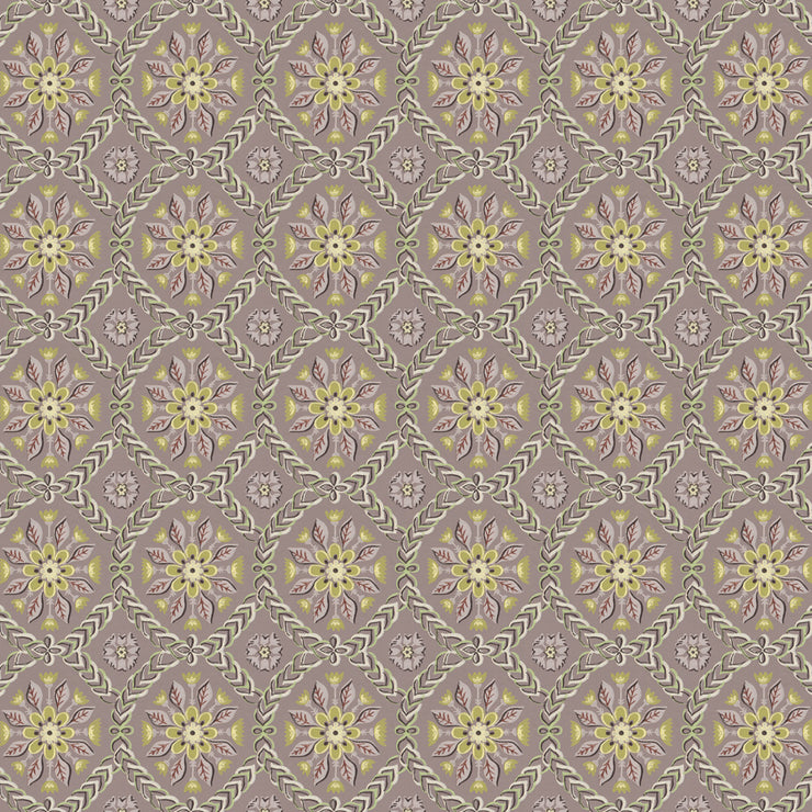 Floral Crest is an ornate design in a mauve colorway. The floral detailing here adds a delicate femininity that perfectly balances out a space. Subtle and refined, this design instantly welcomes a sense of sophistication. Part of our 1940s-1950s wallcovering collection, this is digitally printed to order and can be customized in scale, color, and material.
