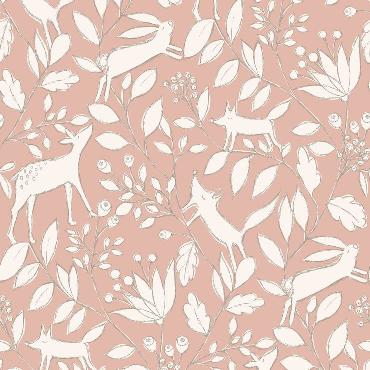 This whimsical wallcovering features sketched forest animals among leaves and flowers.