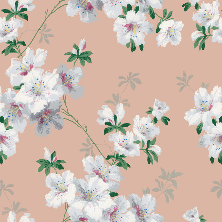 Providence is a delicate floral design with bright white blossoms and a flattering peach background. This pattern is sure to bring an elegance to any space while inviting a refreshed brightness. Part of our 1940s-1950s wallcovering collection, this is digitally printed to order and can be customized in scale, color, and material.