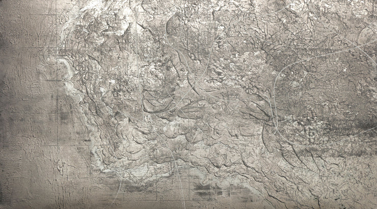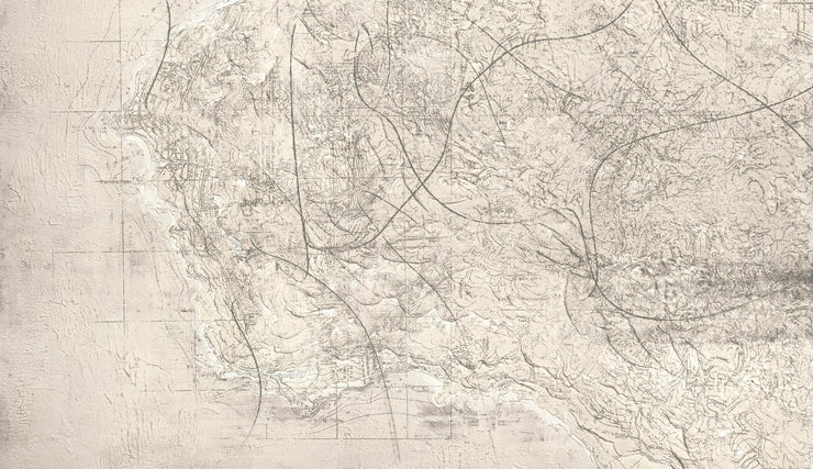 The topographic landscape was physically built up and sculpted to create the shadows and contours in this wallcovering design. Dimensional layers juxtaposed with illustrative lines create a rich geographical experience. This design is available on a wide range of materials, sized and digitally printed to order, and available for color and/or scale customization.