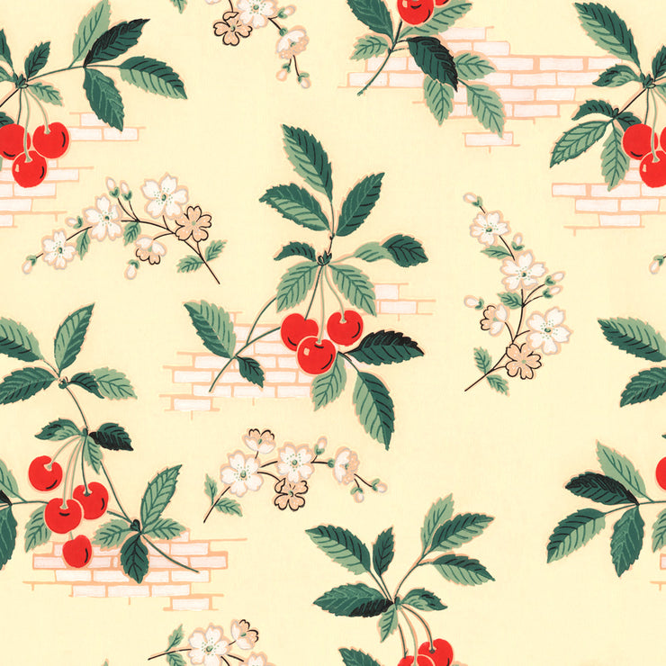 Sunny invites a sense of happiness that comes with fruits in the summertime. The red pops of color come from the cherries in the design, livening up any space effortlessly when paired with off-white blossoms. Part of our 1940s-1950s wallcovering collection, this is digitally printed to order and can be customized in scale, color, and material.