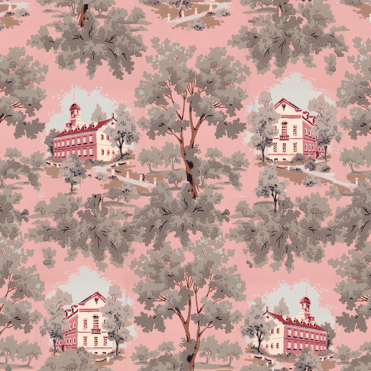 Villa is a vintage design featuring a southern-style home. This pattern depicts trees alongside the homes, paired with a retro pink background. Part of our 1940s-1950s wallcovering collection, Villa is digitally printed to order and can be customized in scale, color, and material.